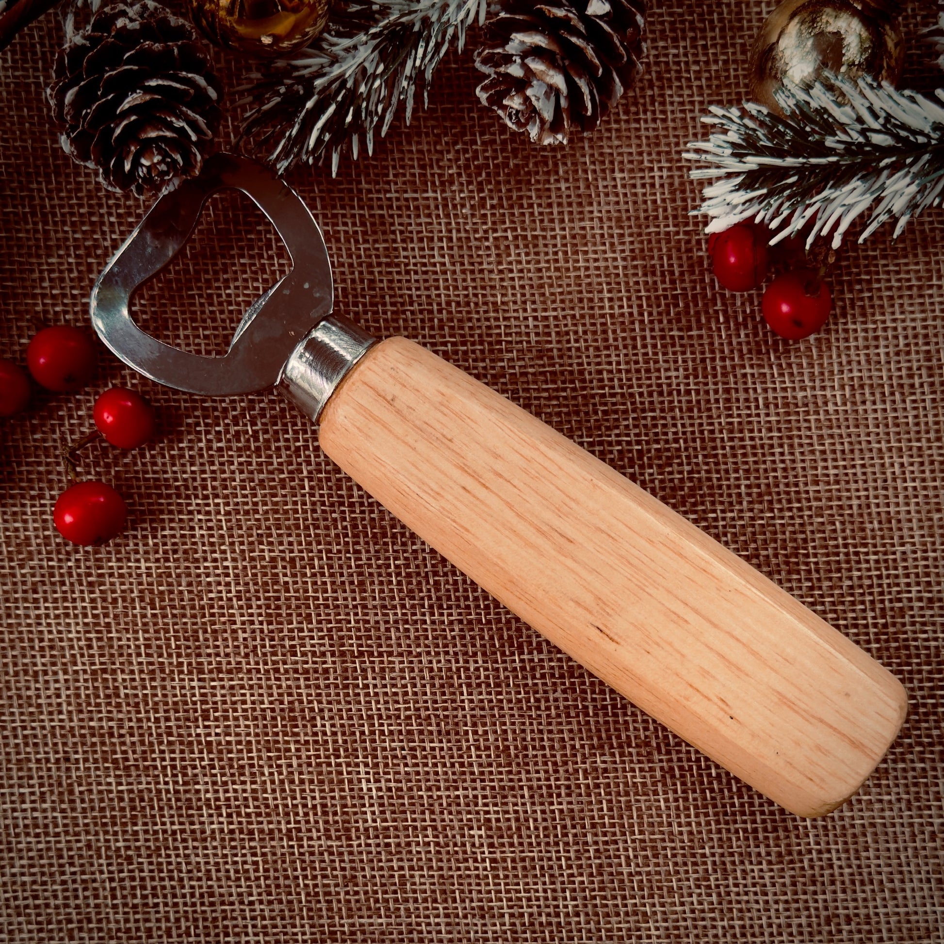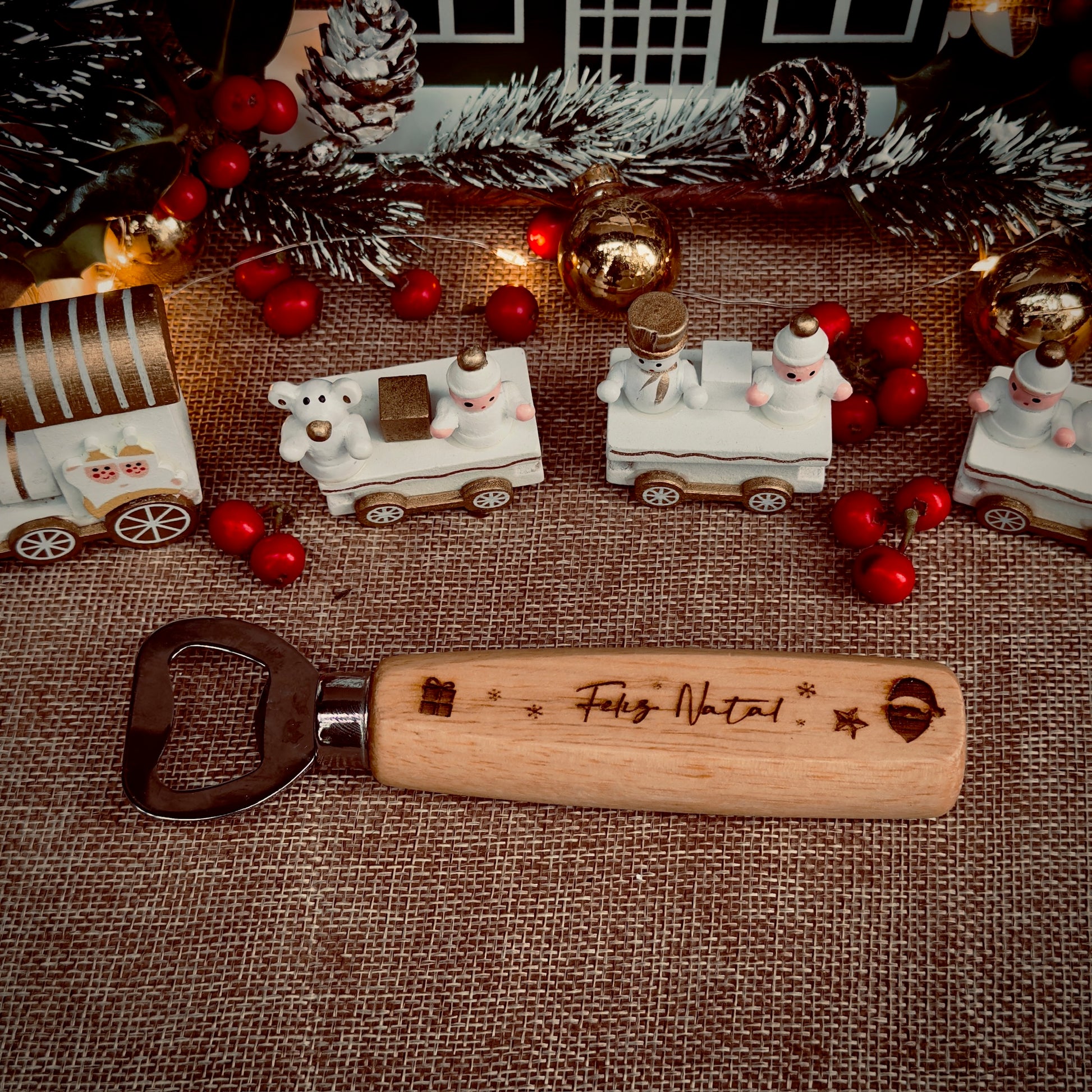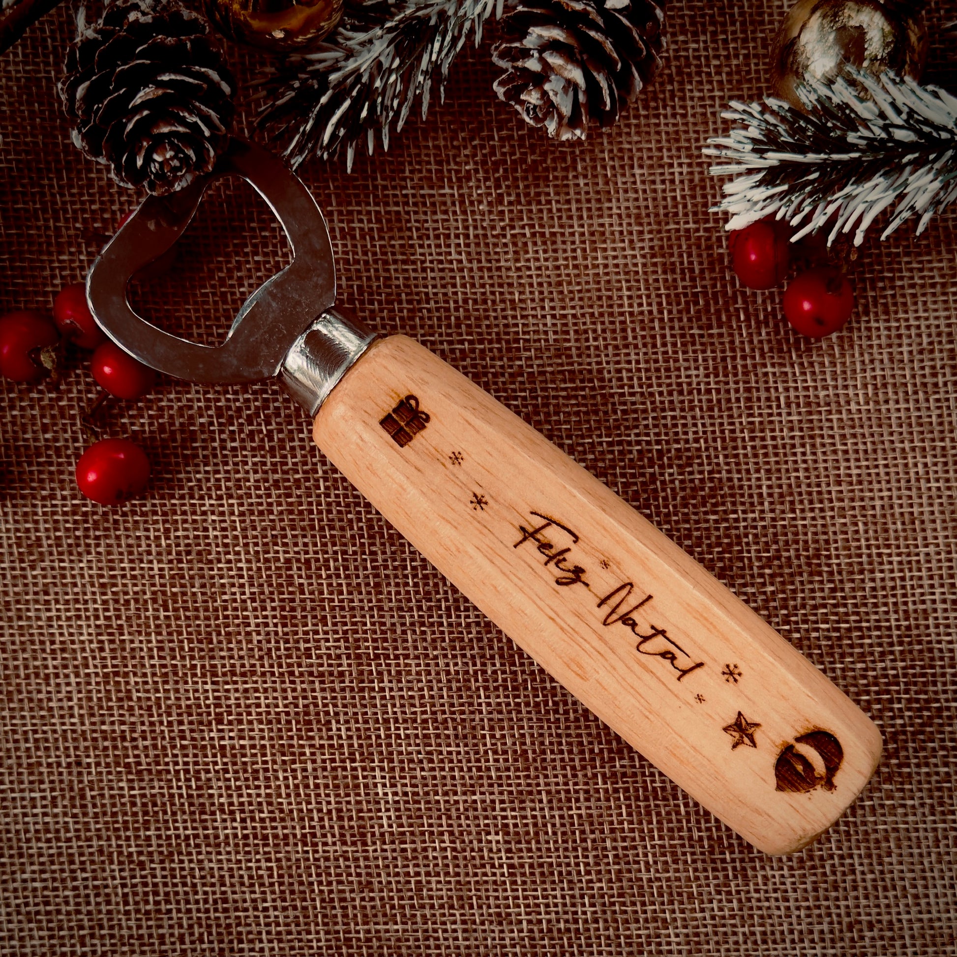 Abre cápsulas em madeira com gravação a laser, podendo incluir um nome personalizado.