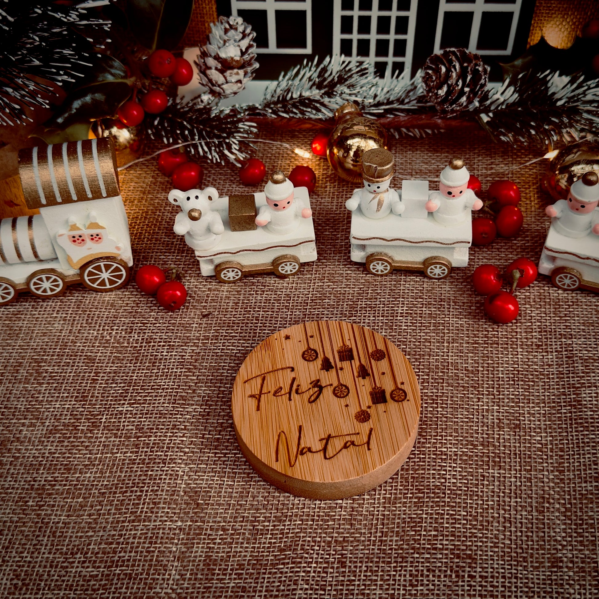 Abre cápsulas em bambu com gravação a laser “Feliz Natal”.
