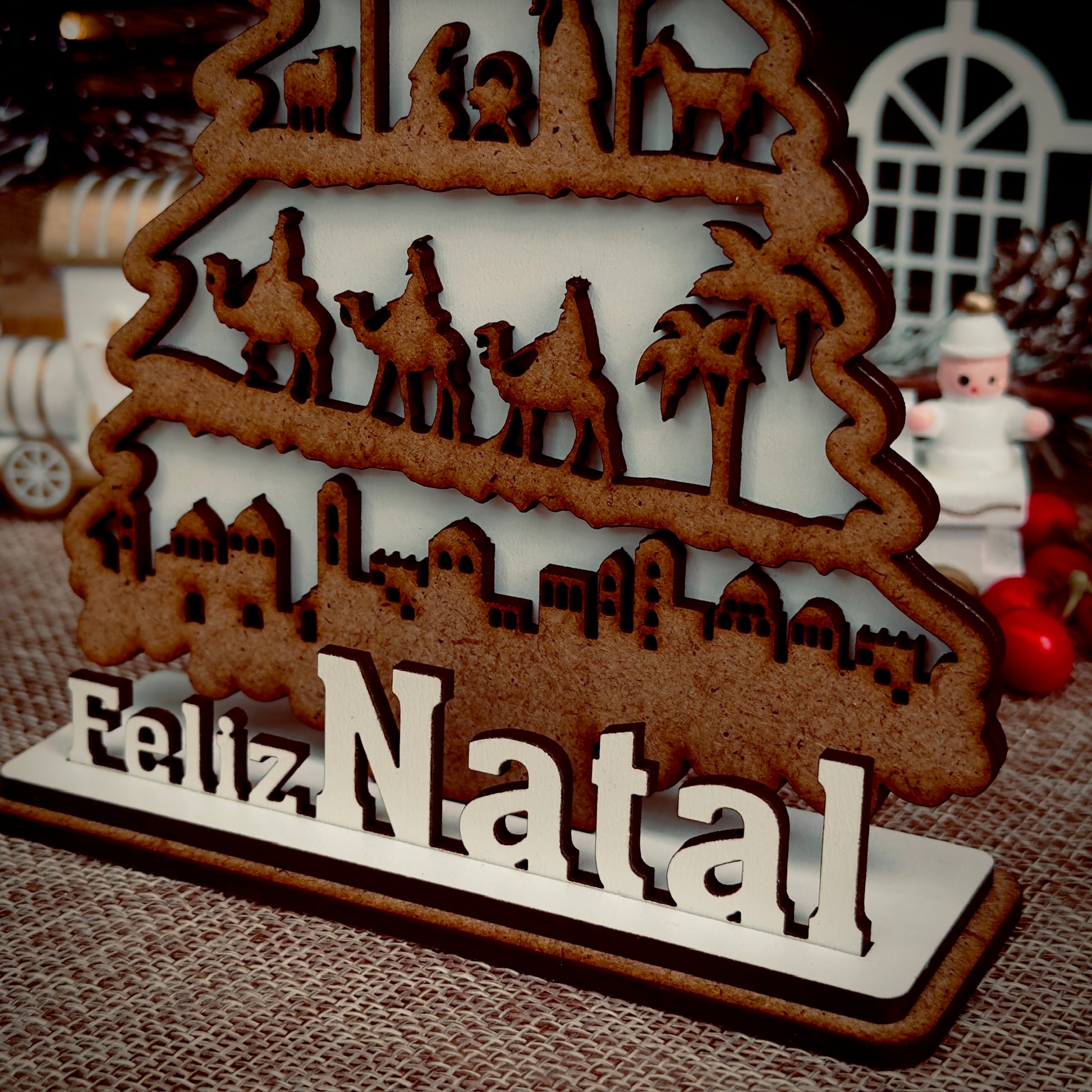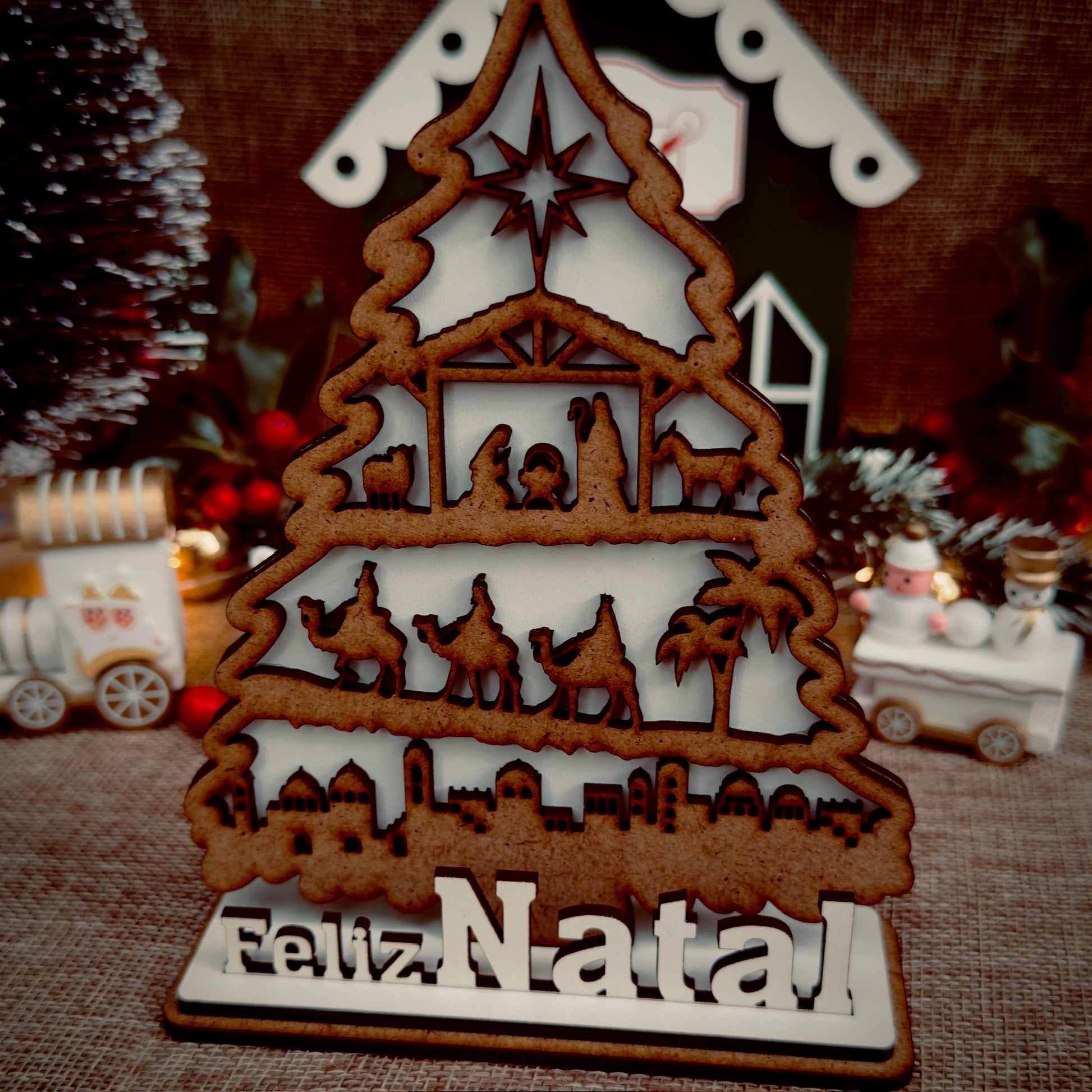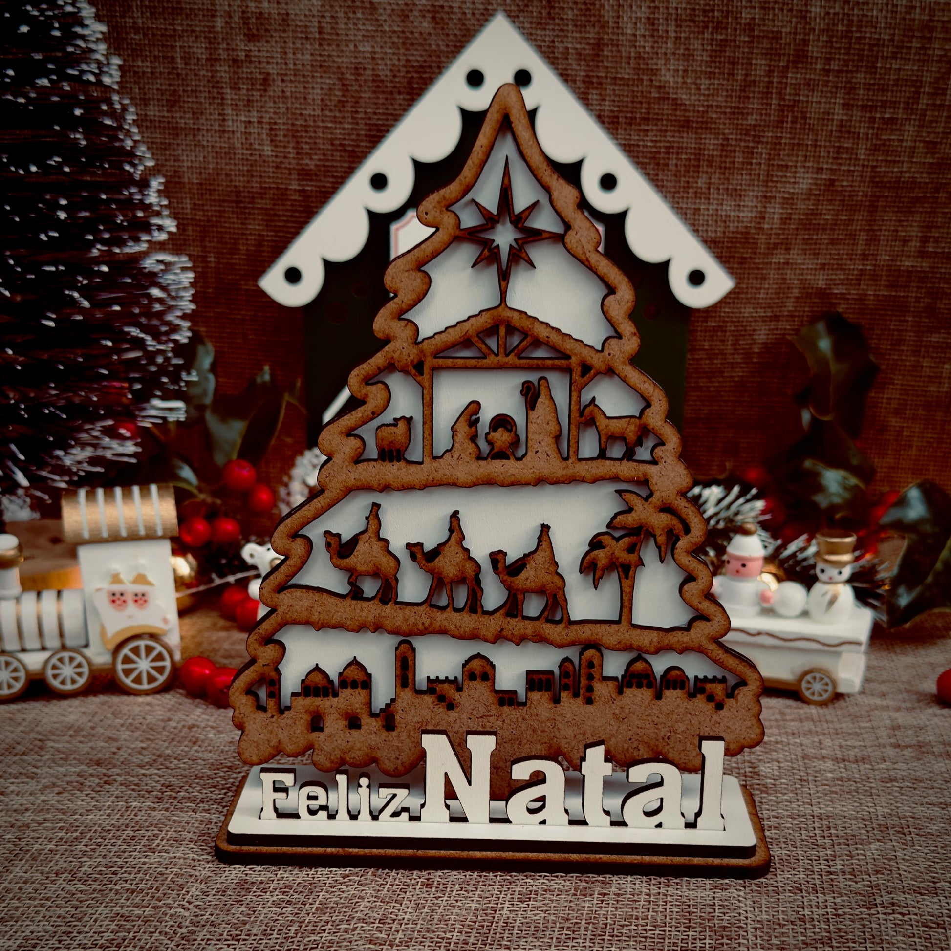 Árvore de Natal em madeira com presépio detalhado através de corte e gravação a laser.