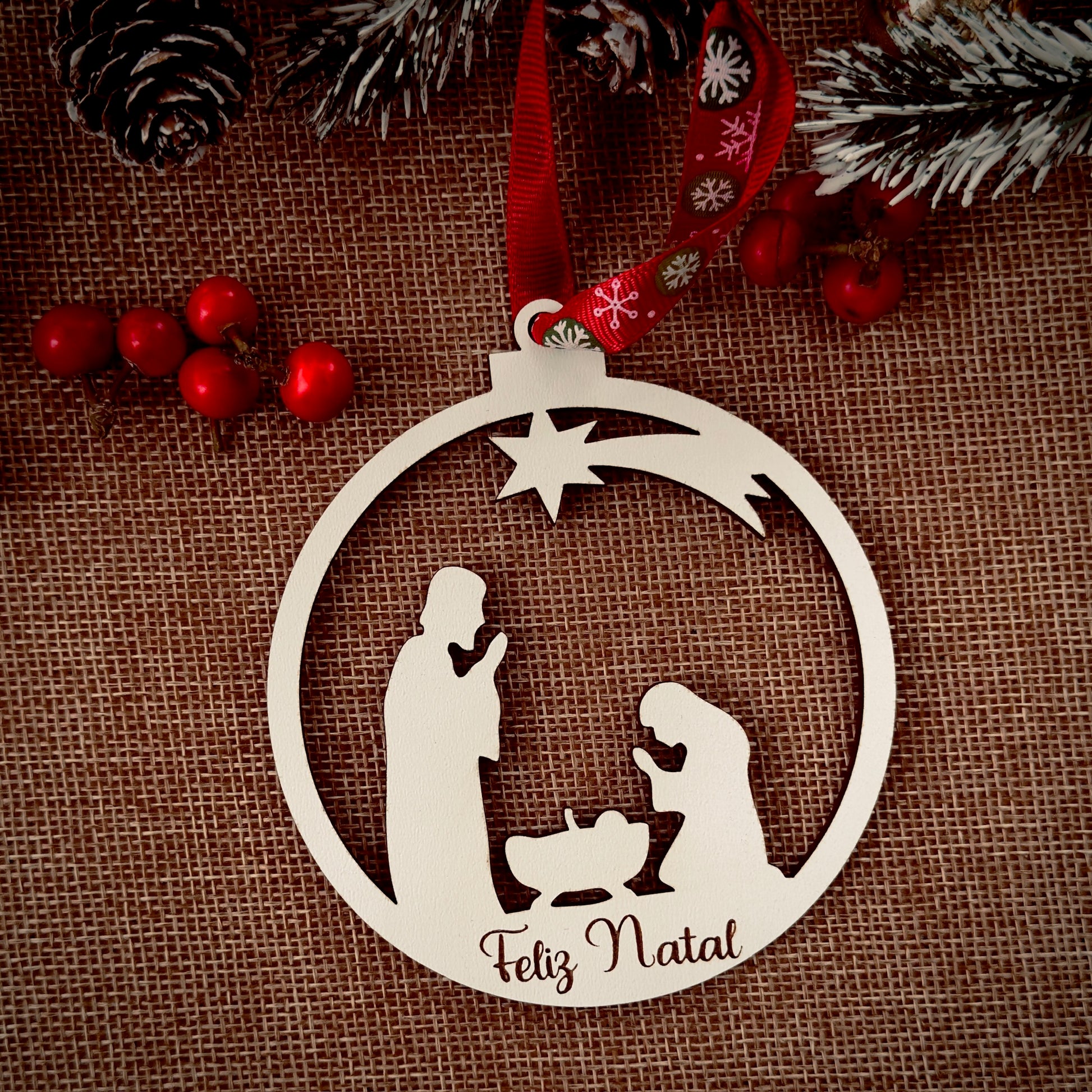 Decoração natalícia em forma de bola com o presépio recortado, perfeita para dar um toque espiritual e elegante à árvore de Natal.