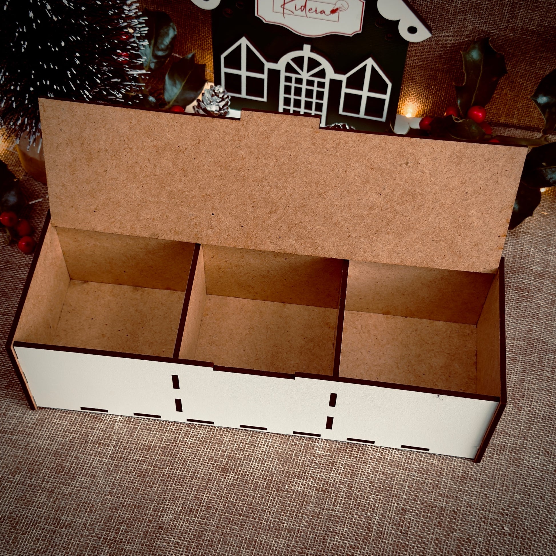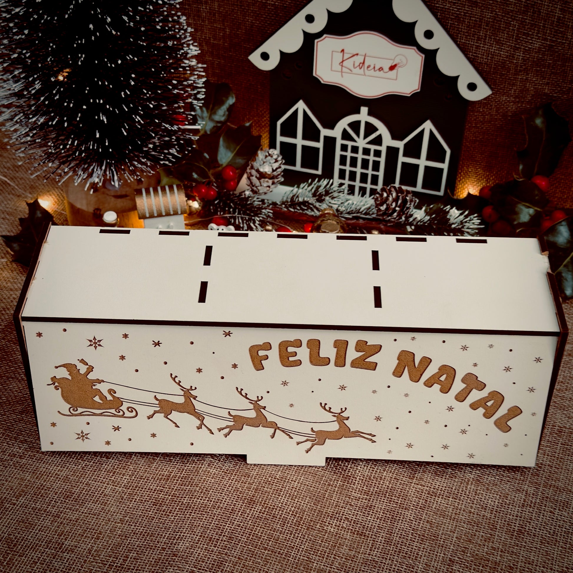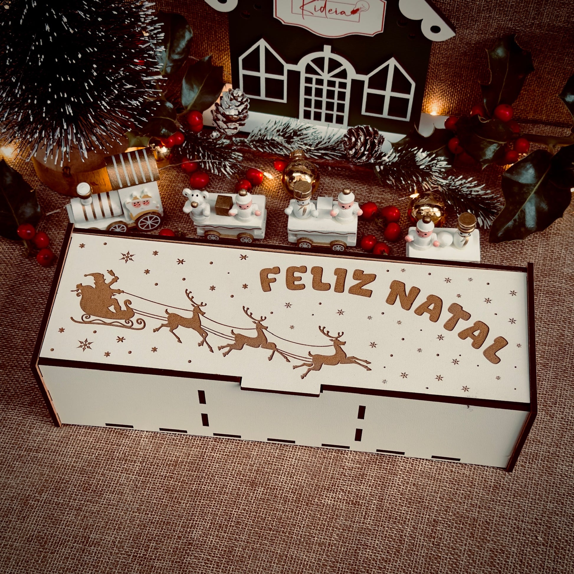Caixa de chá artesanal em madeira com tampa gravada “Feliz Natal” e ilustração das renas.