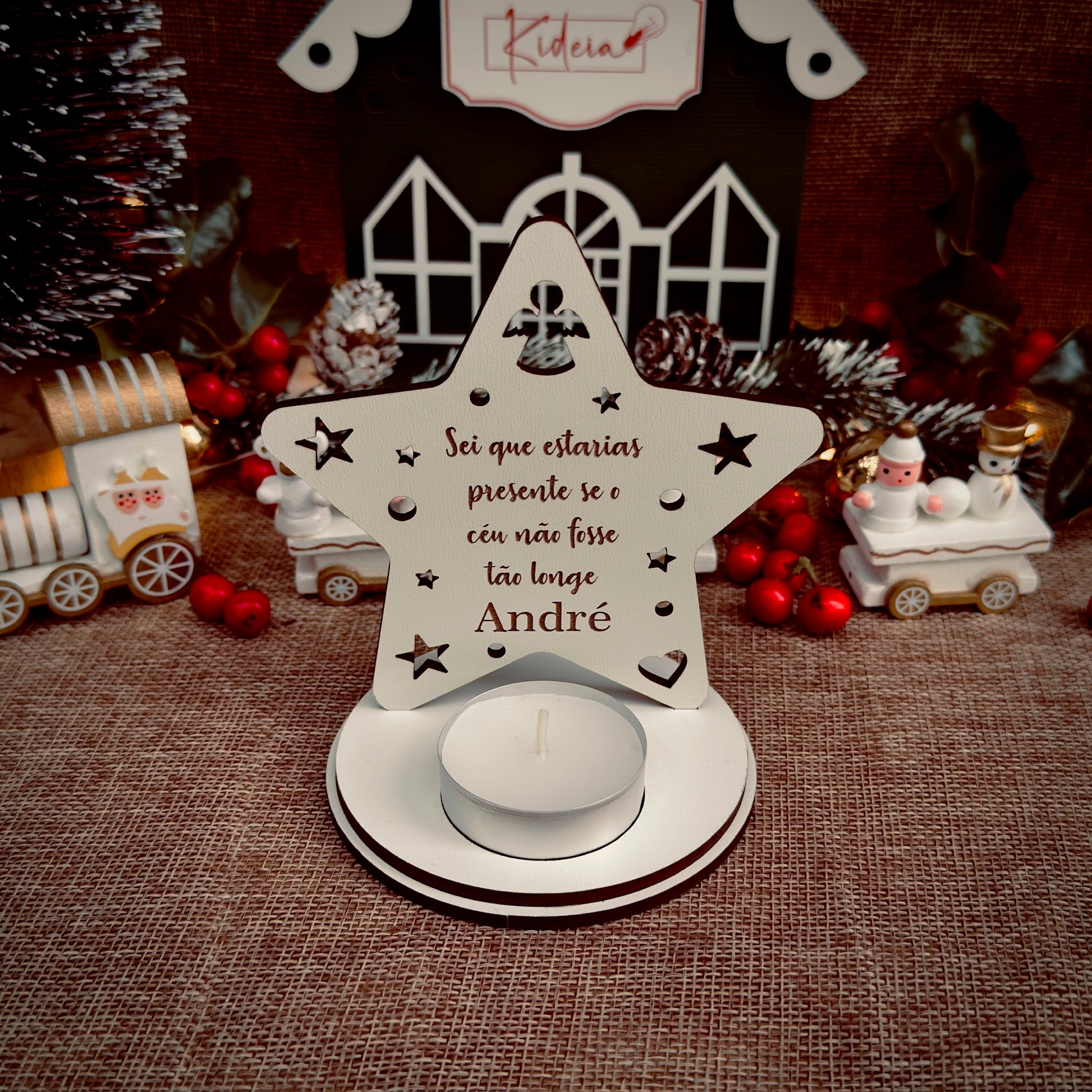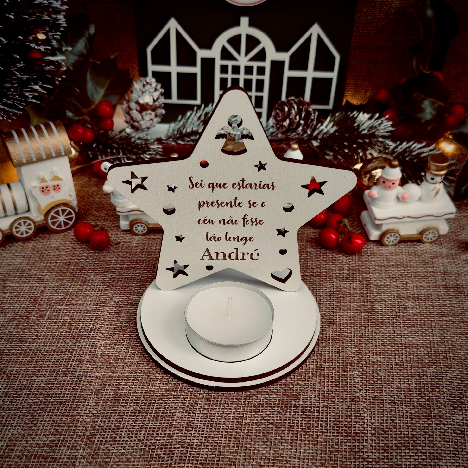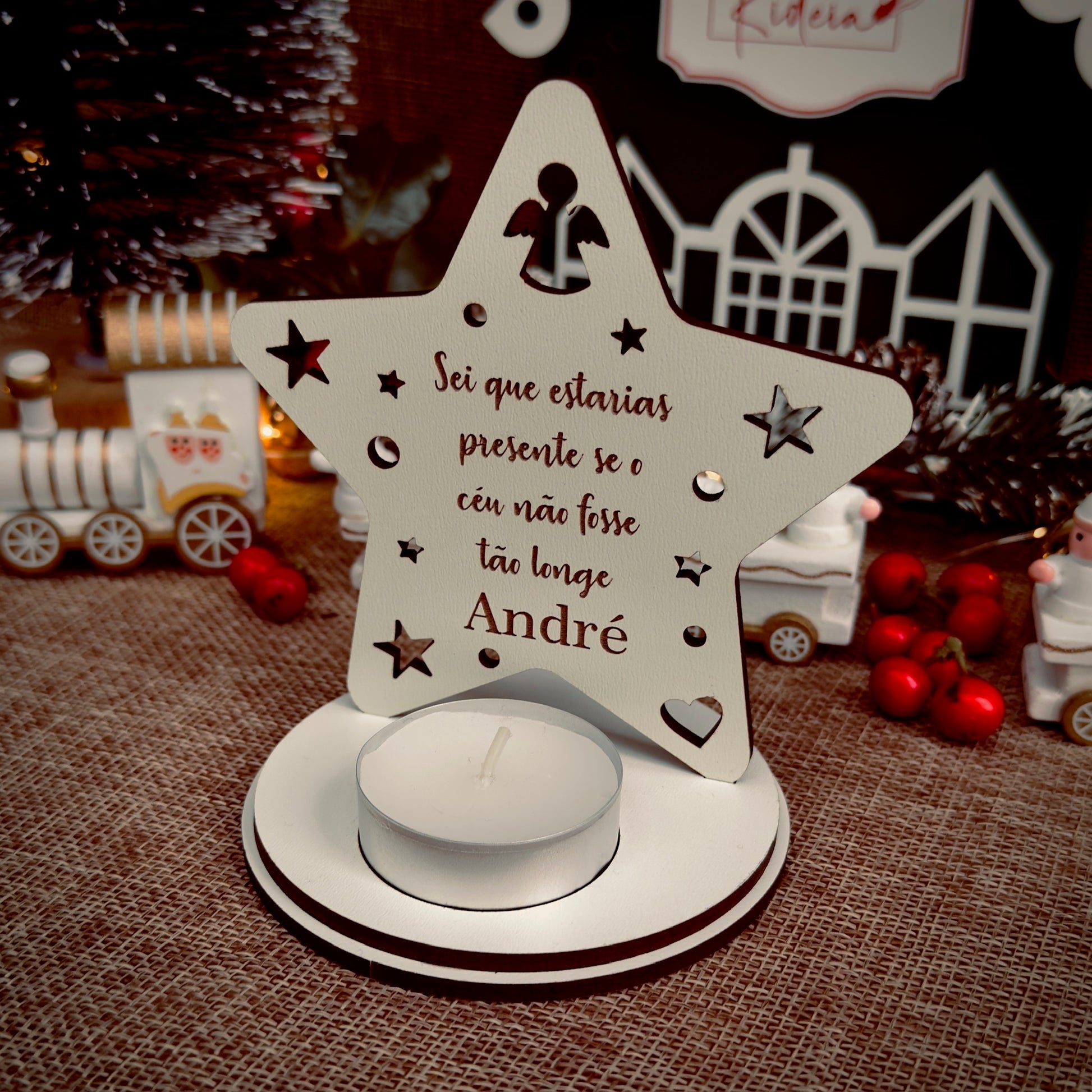 Estrelinha artesanal em madeira com suporte para vela, perfeita para homenagear quem vive no coração.