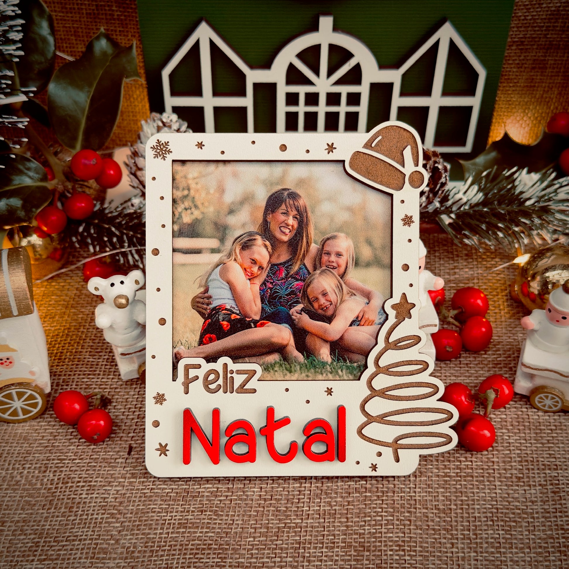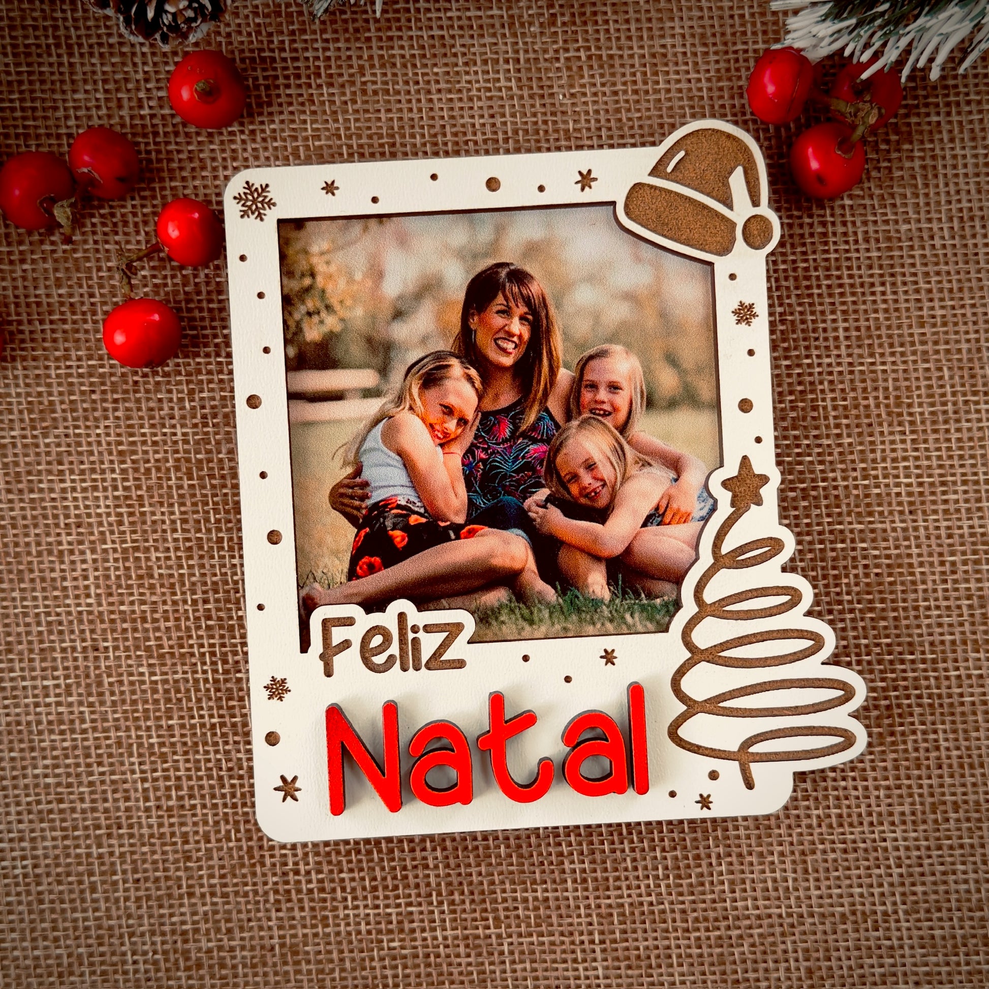Íman de Natal com impressão UV da sua foto a cores e detalhe “Natal” colado em relevo vermelho.