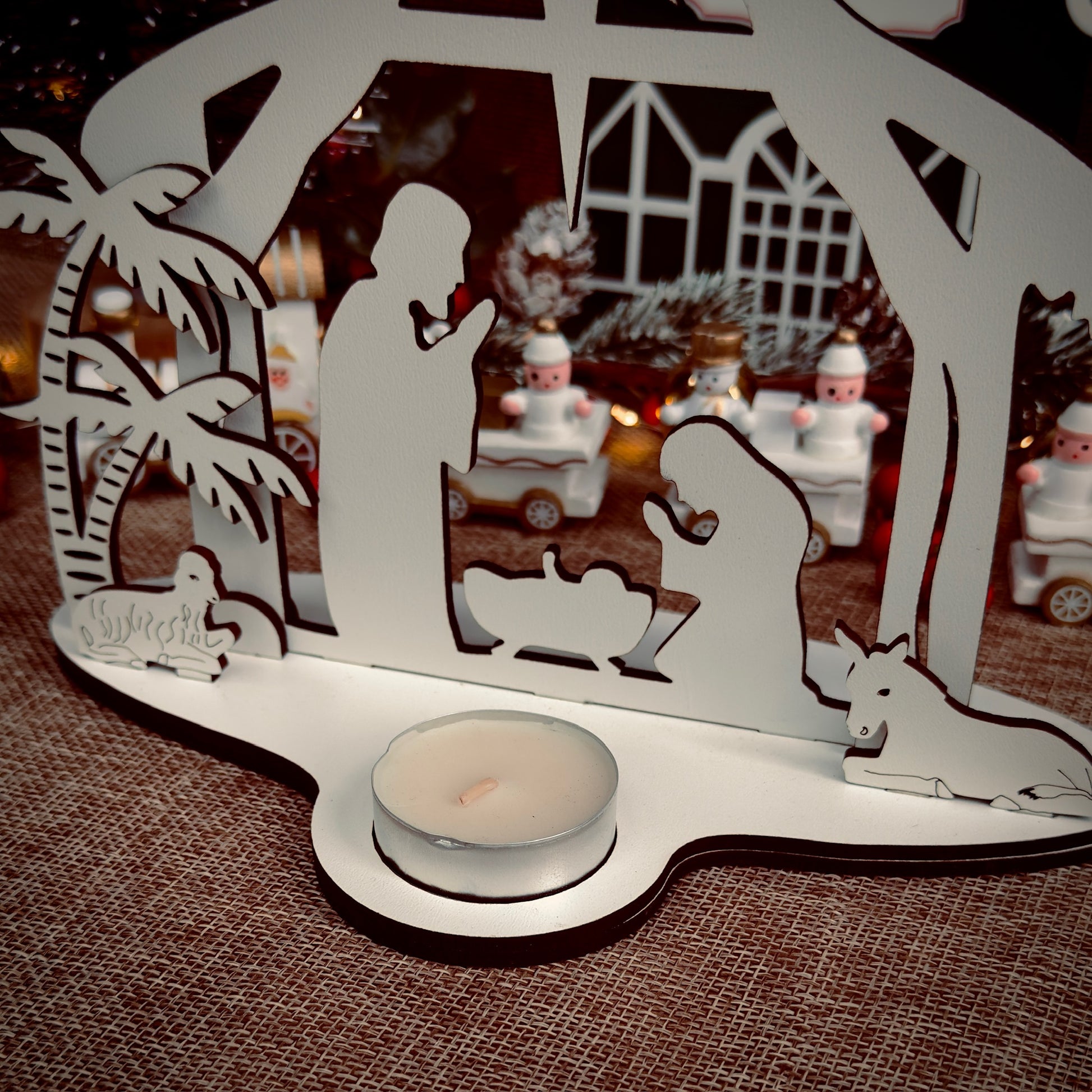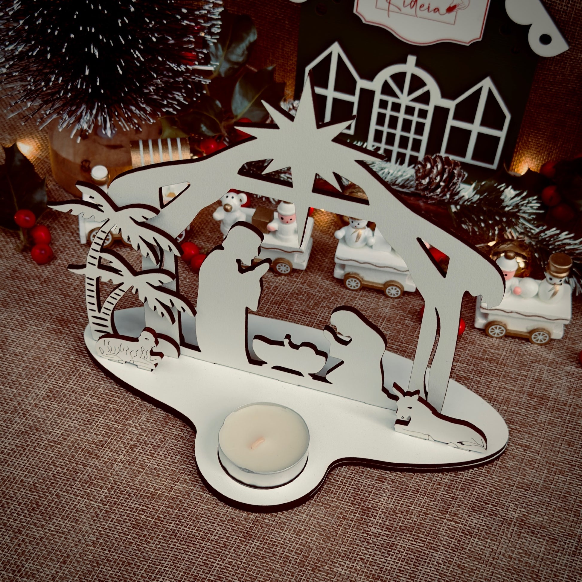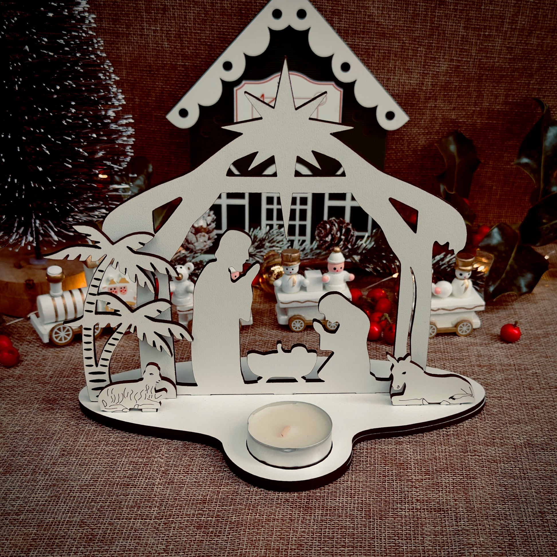 Presépio em madeira com suporte para vela, que ilumina com ternura o nascimento de Jesus.