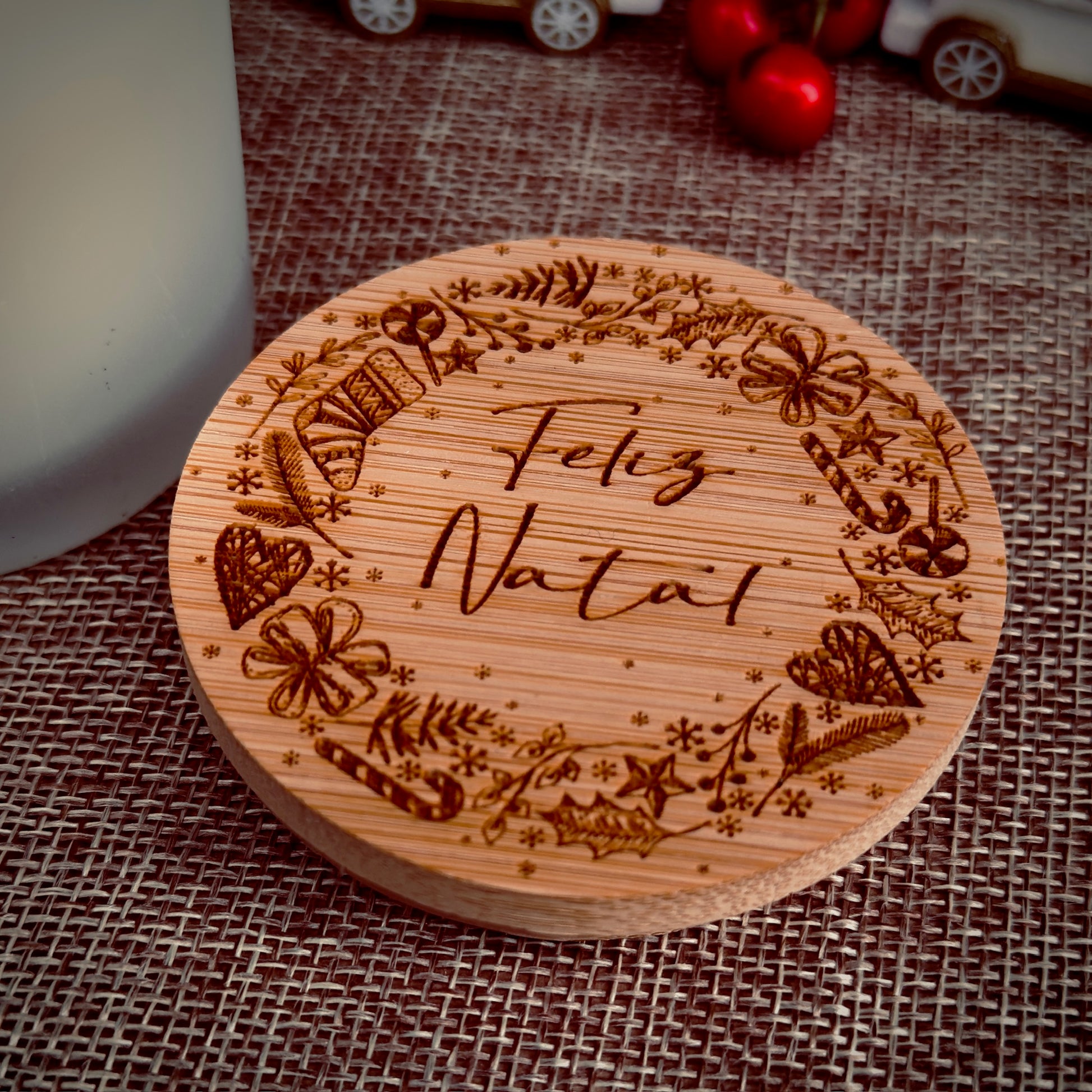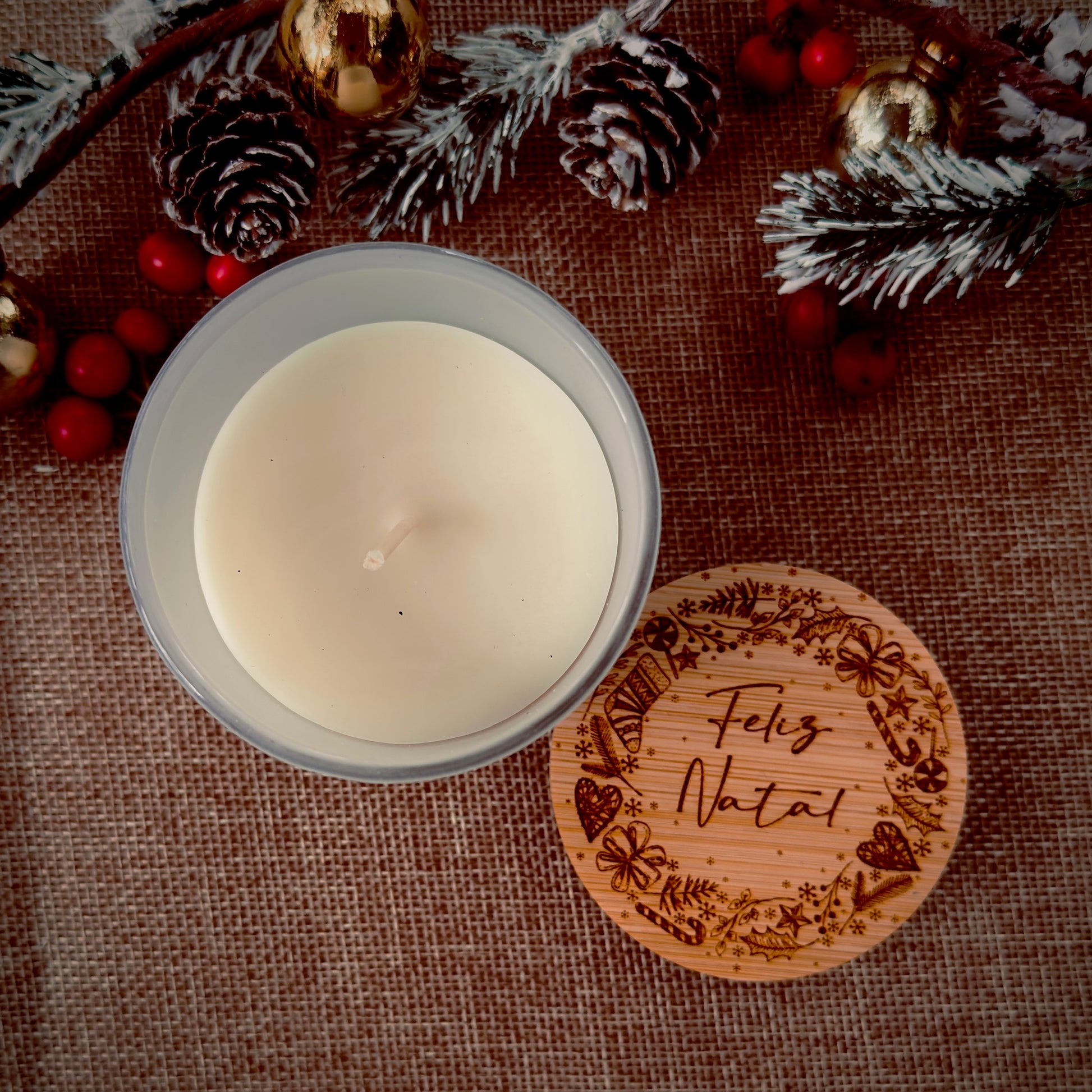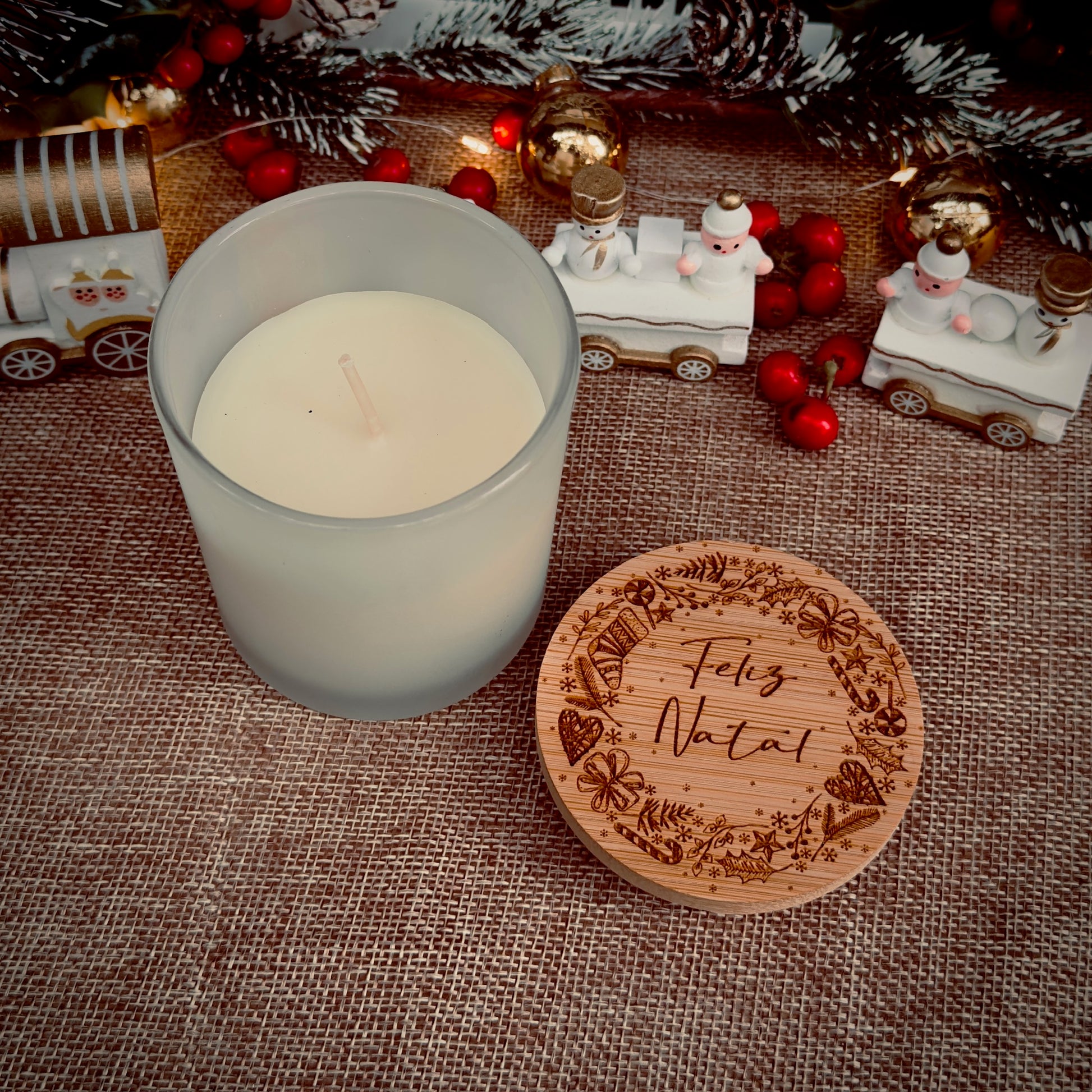Vela aromática de baunilha em copo de vidro fosco, com tampa em bambu gravada a laser “Feliz Natal”.